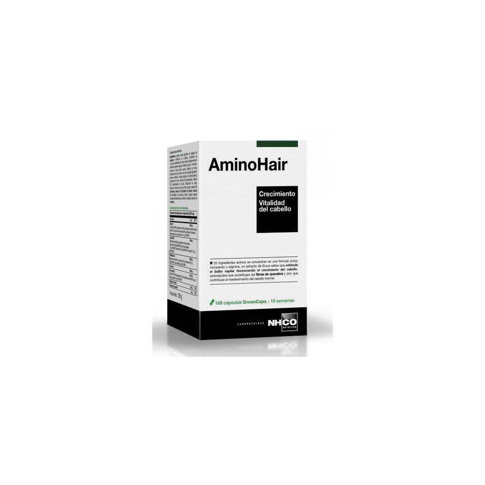 NHCO AminoHair 168caps es un complemento alimenticio 100% vegetal, elaborado a base de extractos botánicos, vitaminas y minerales esenciales, que ayuda a mantener la salud capilar y la estructura de las uñas.